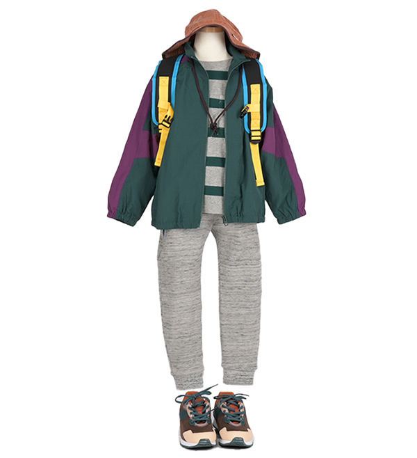男の子用アウトドアのコーディネート例です。ブルゾン、カットソー、パンツ、リュック、ボウシ、ブーツまでをご用意しております。