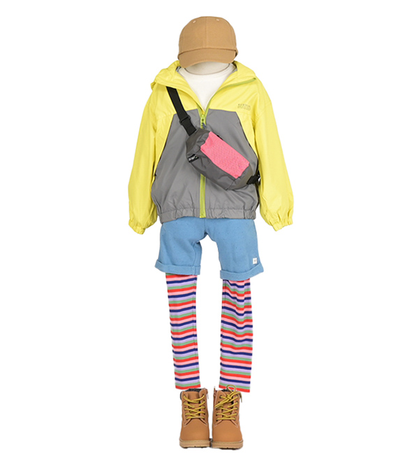 女の子用アウトドアセットのコーディネート例です。ブルゾン、カットソー、ショートパンツ、レギンス、ブーツ、バッグ、帽子までをご用意しております。