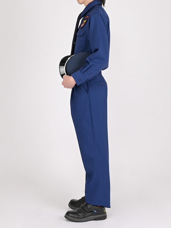 消防士風のコーディネート例です。ユニフォームブルゾン、ツナギ、ヘルメット、安全スニーカーまでご用意しております。